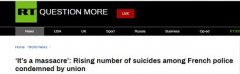 【环球网报道 实习记者 和怡然】法国媒体报道本周末法国发生两起疑似现役警察自杀的案件,警察工会对频繁发生的警察自杀事件对此表示非常愤怒,表示这是一场屠杀。 RT报道截图...